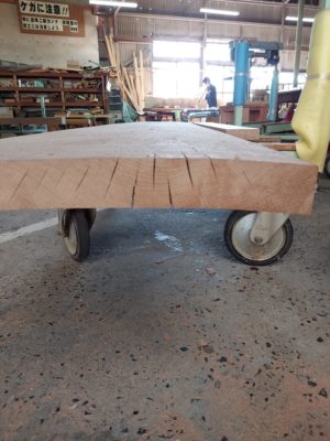 しかし、乾燥不十分な木材を使うと、写真のように割れが発生して化粧材としては、使えません。(これでも、まだ全然乾いていません。)