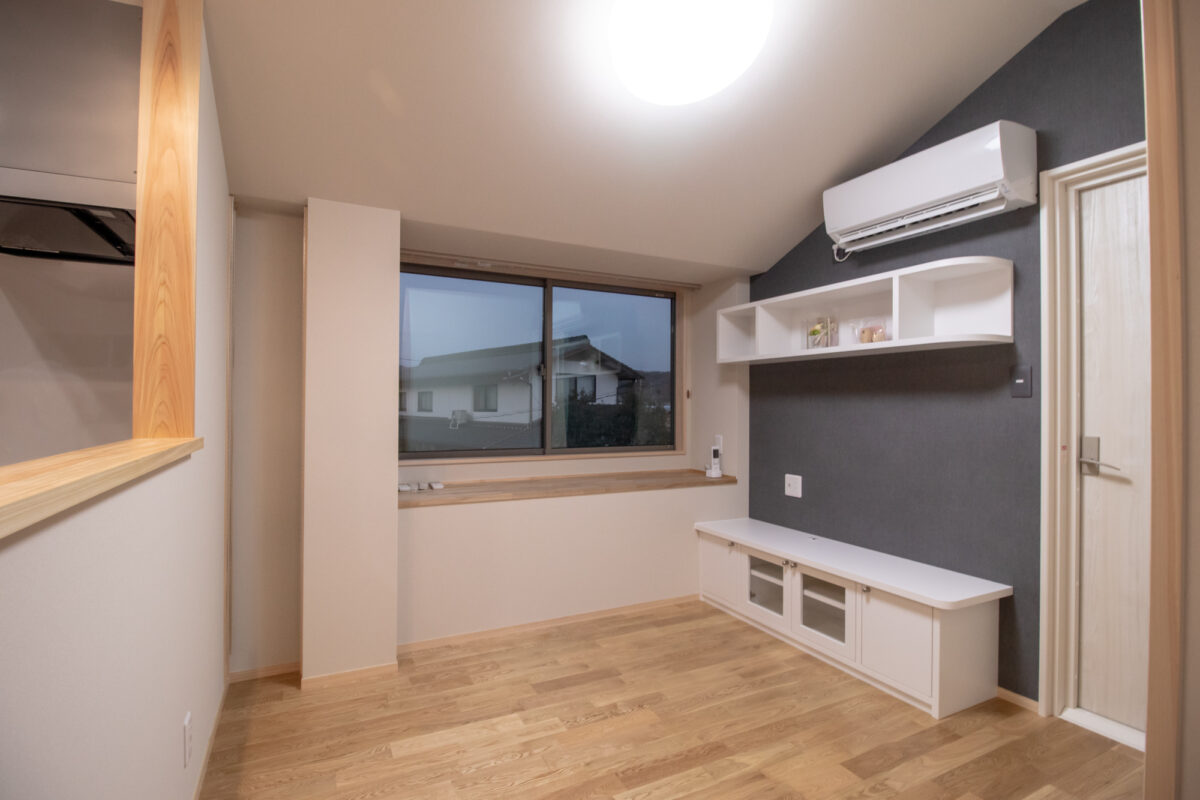 リビングの明かりと風通しの為に、間仕切り壁に上下に2段の窓を。
