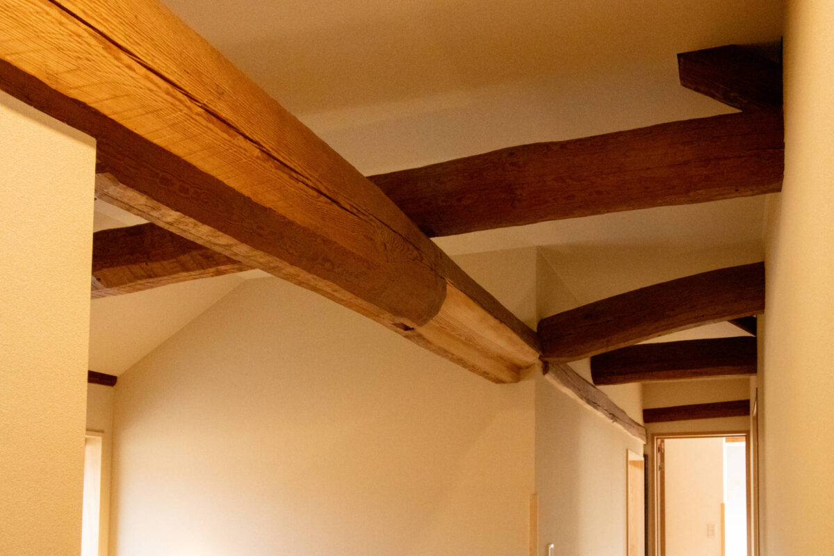 古民家特有の重厚な構造梁と天井板はそのまま化粧に表して、大黒柱も再生。