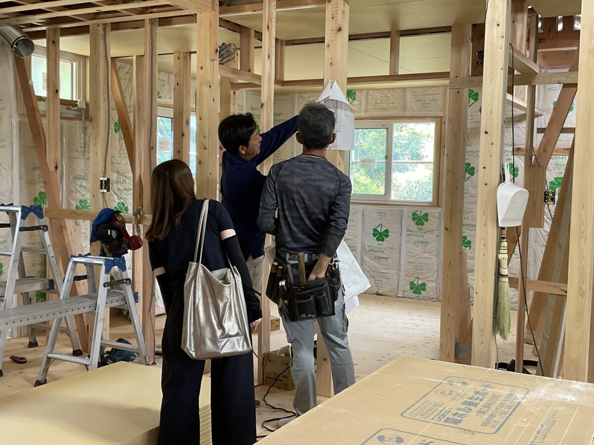 監督とコーディネーターが大工さんと打合せ中。