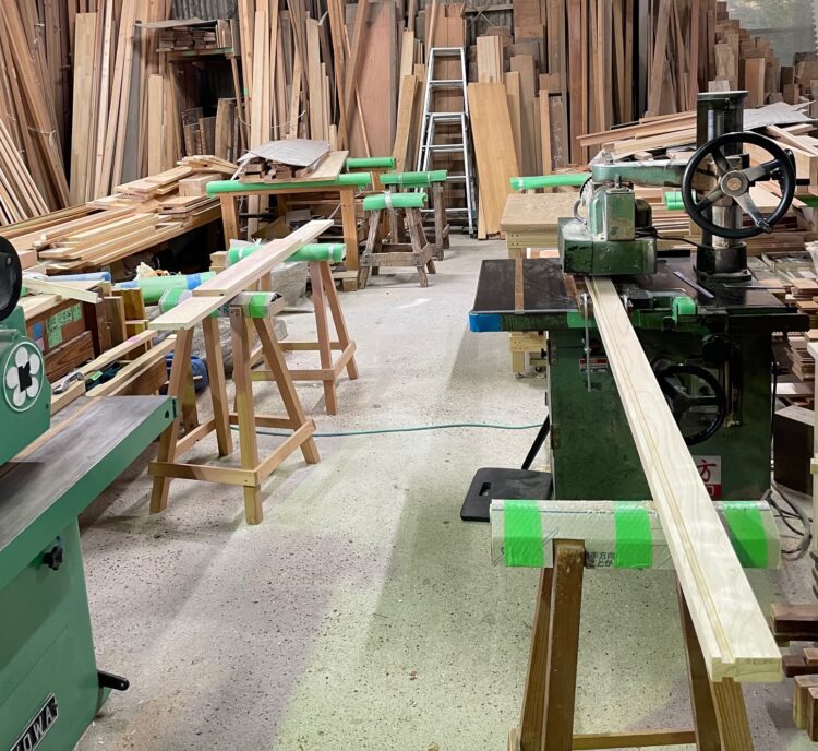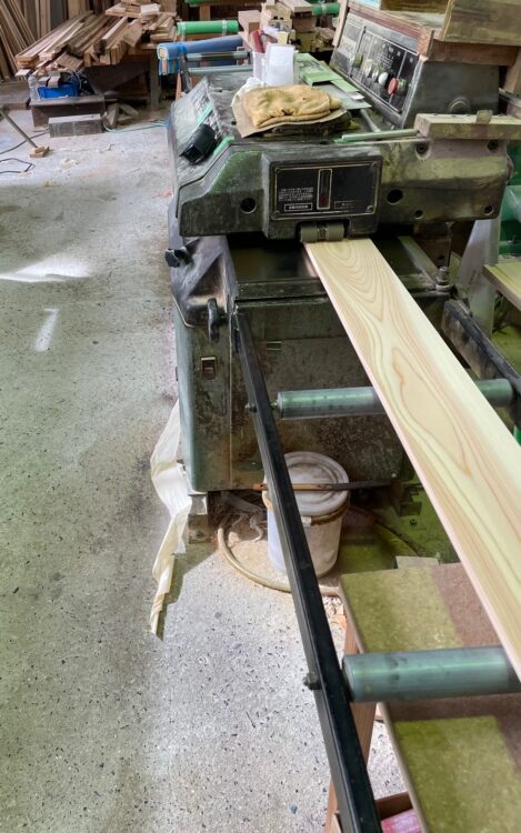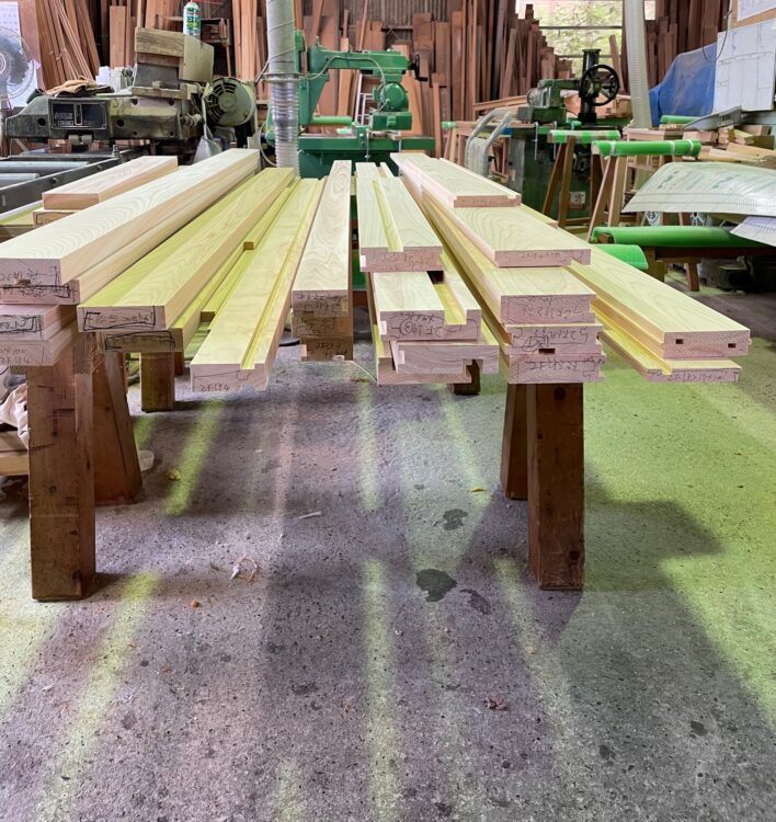 加工場では木材を加工して家の内外部の化粧材(見える部分に使う材)を作っています。