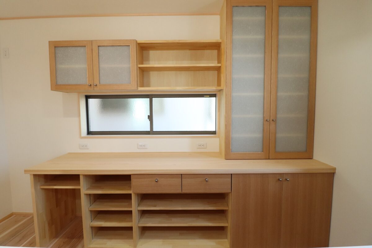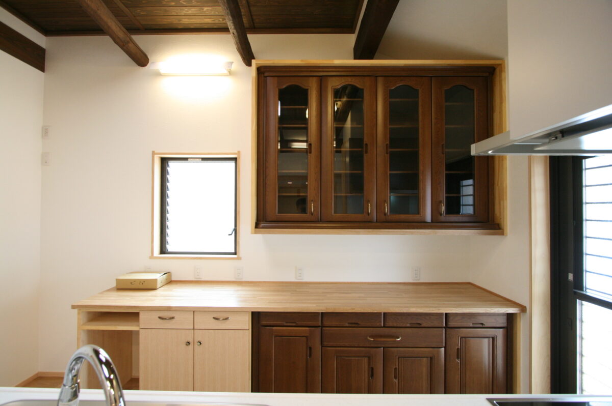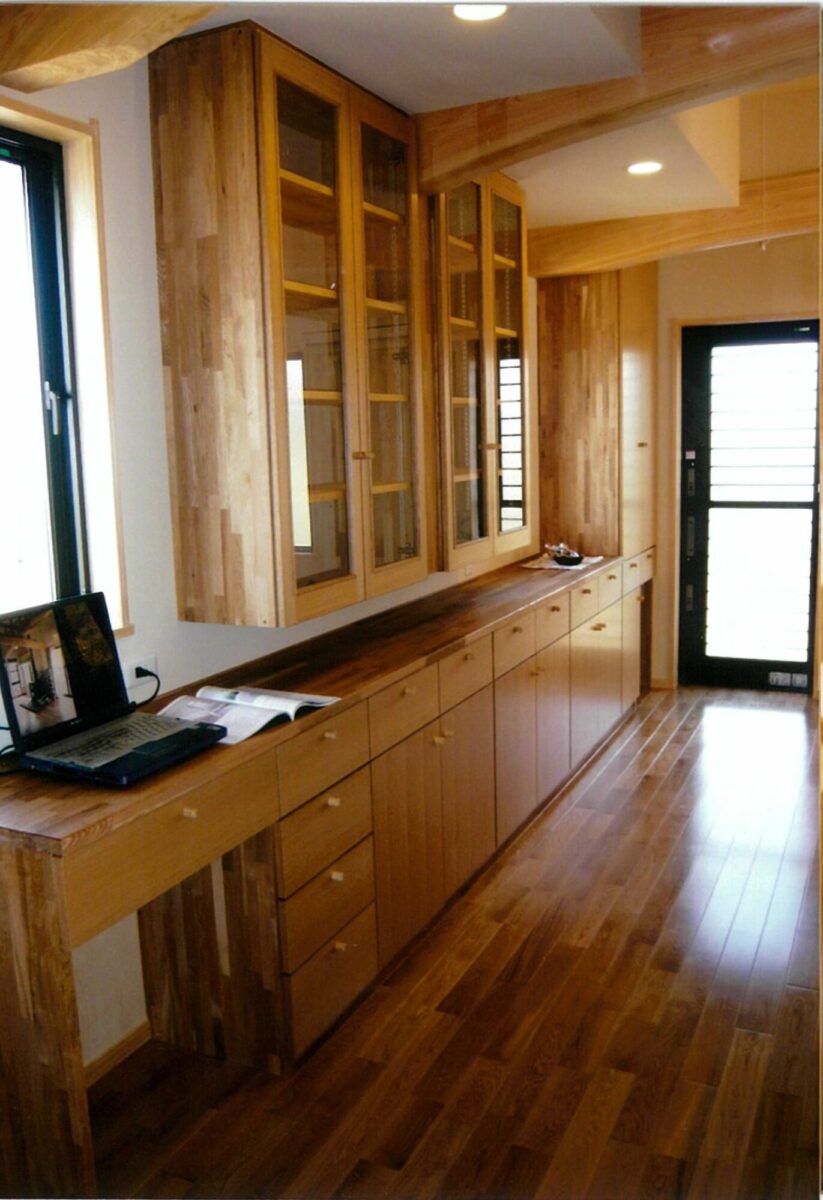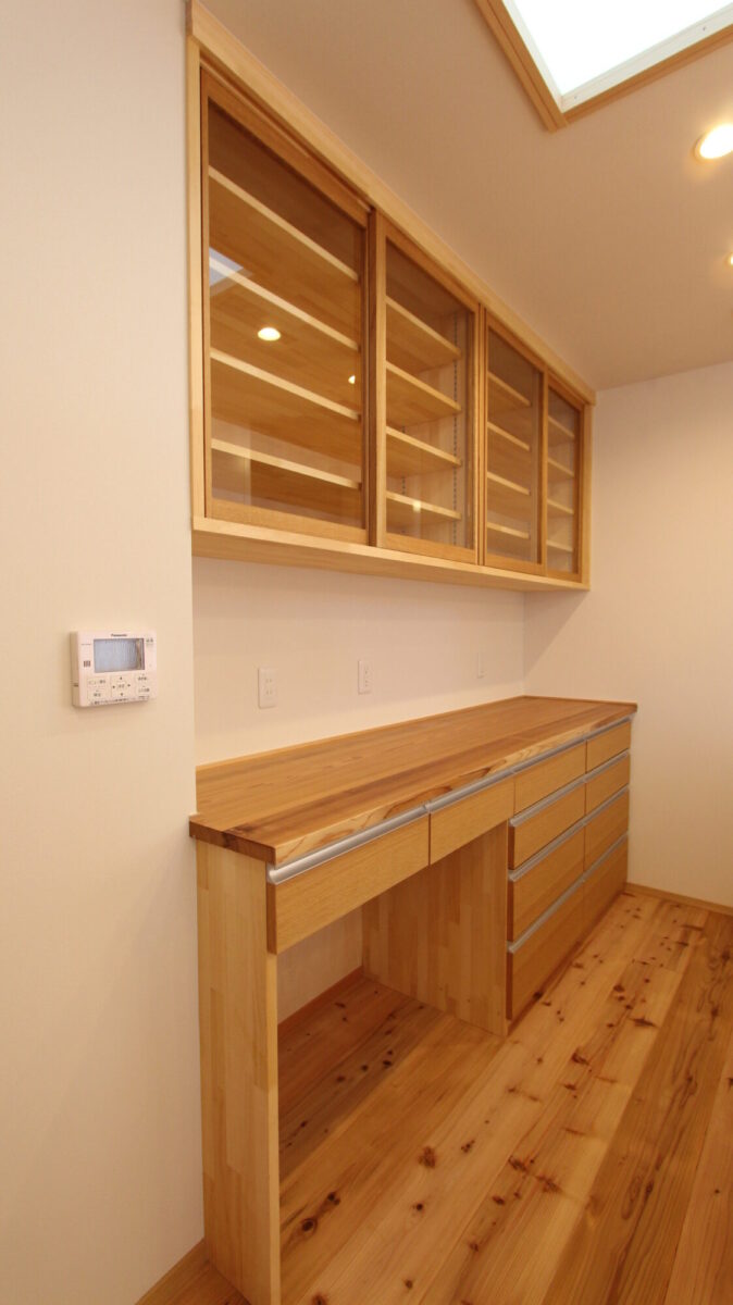 家族の思い出と、経済効果も期待して、お手持ちの食器棚を組み込んで造り付けとしました。