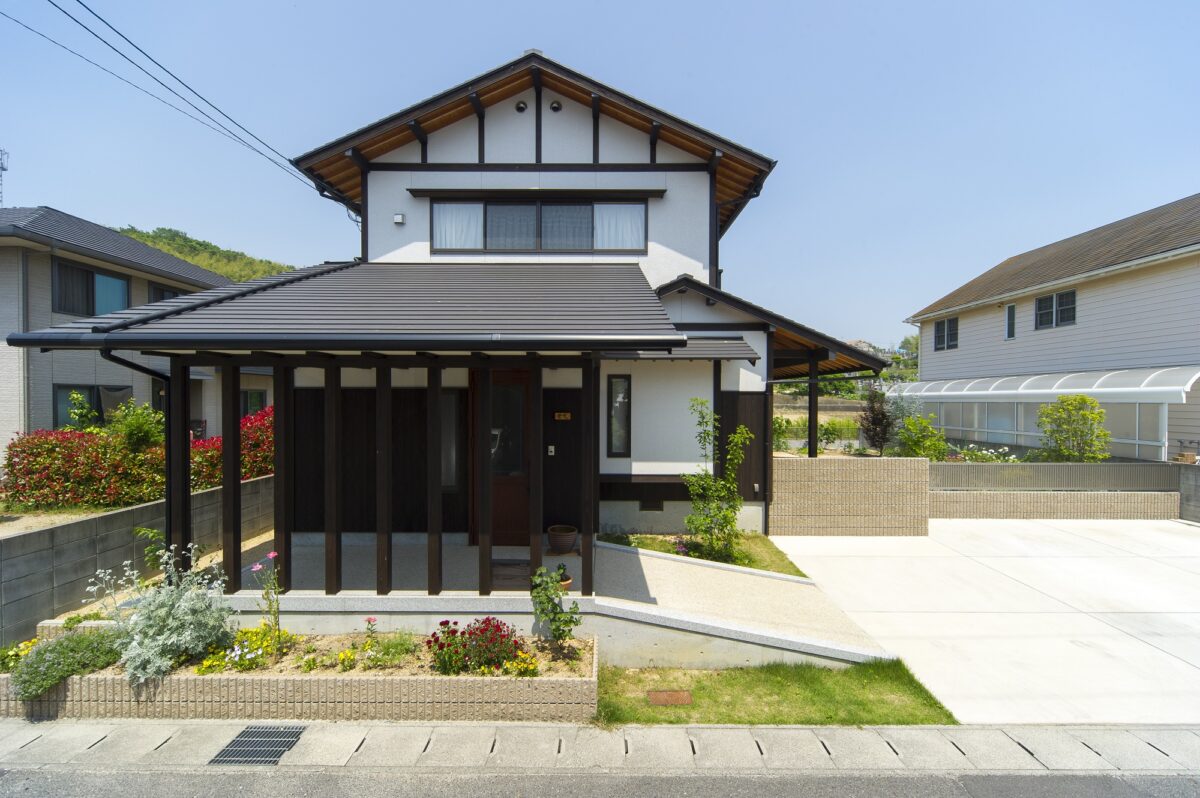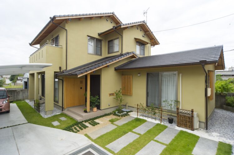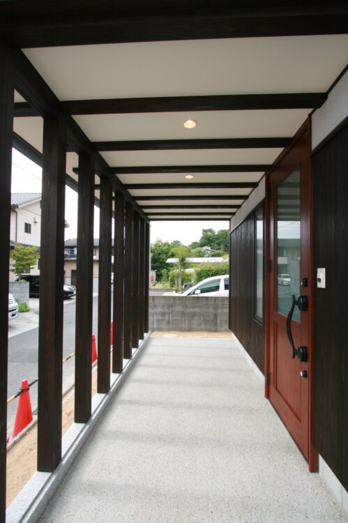 駐車場から、スロープにてのアプローチ。大きな屋根の下の玄関ポーチです。