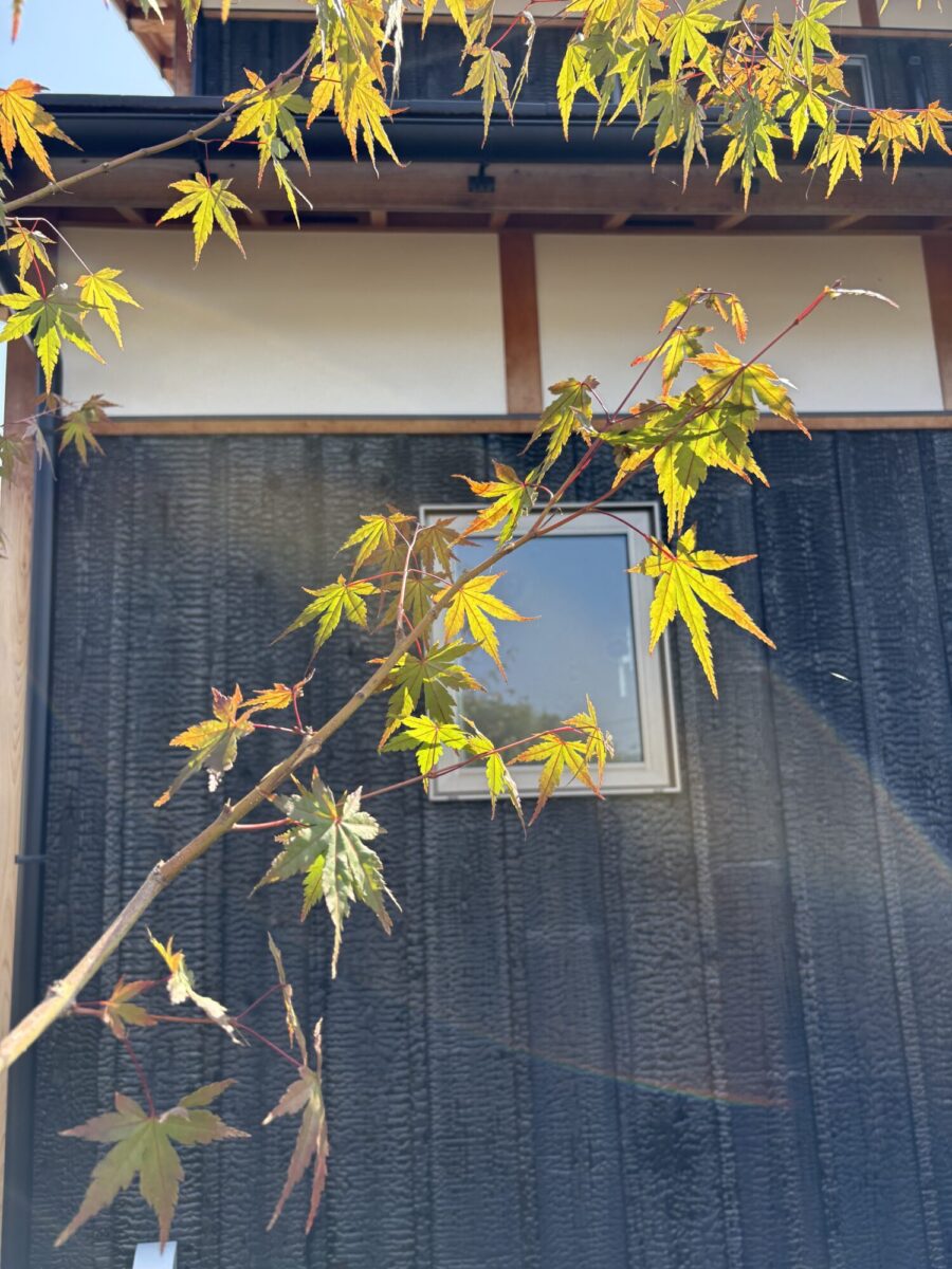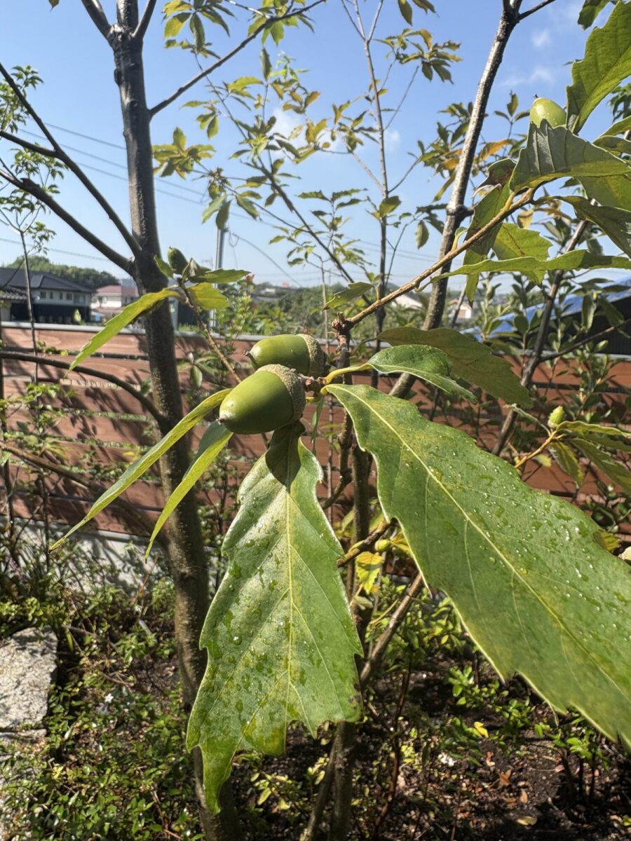 お庭の植栽に小さなどんぐりの緑の実がなっていたり、見上げるとイロハモミジの葉が少しずつ色づき始めています。季節の移ろいを植栽から感じ取れるのは、庭づくりの楽しみのひとつです。