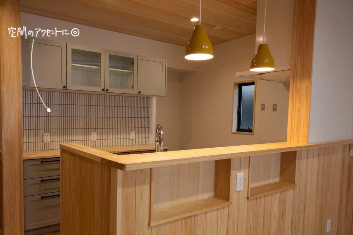 木目調のカウンターに合わせたライトグレーの縦貼りタイルは、空間にほどよいリズム感を生み出します。