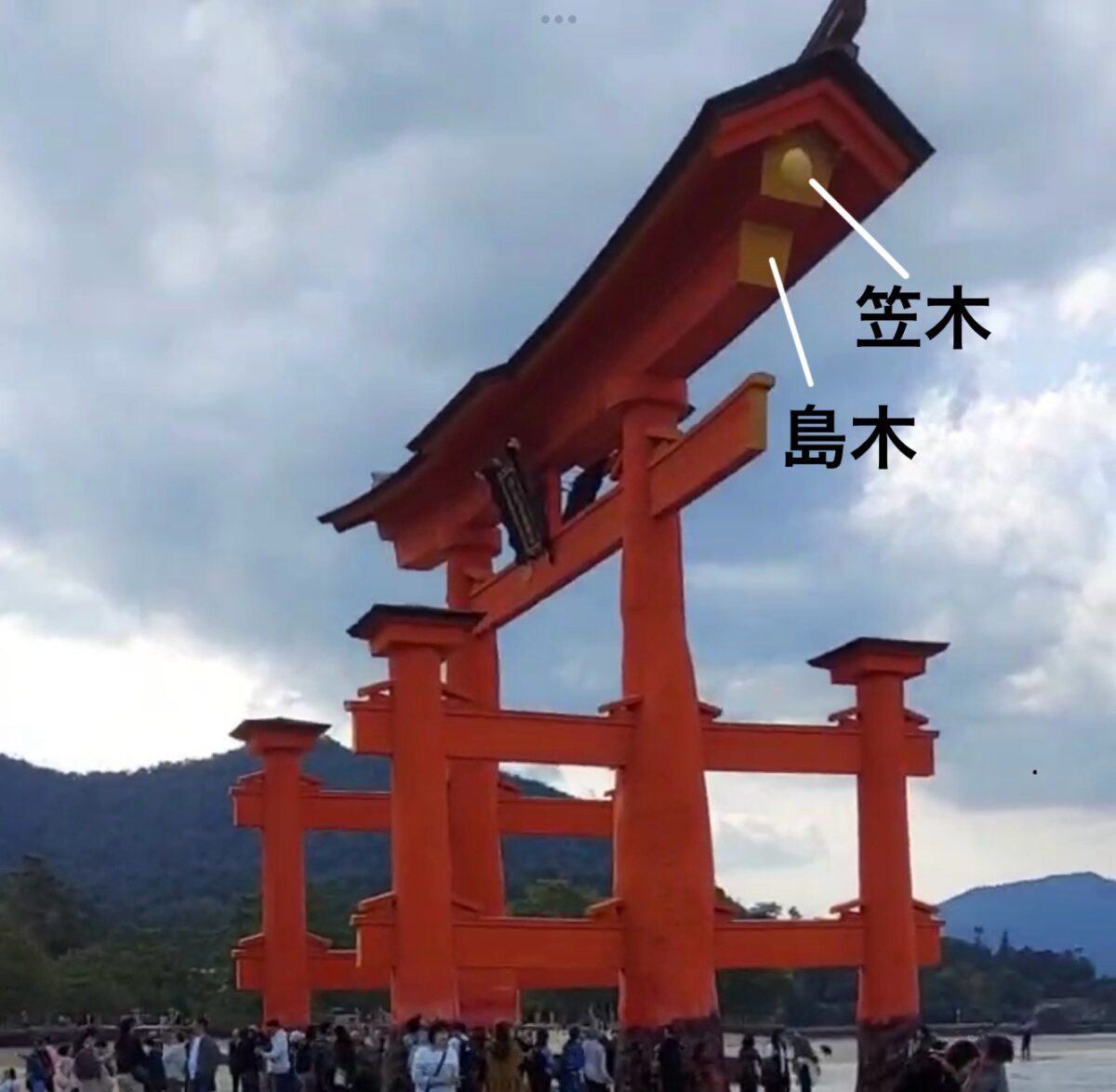 大鳥居の最上部にある「笠木」と、その下にある「島木」。