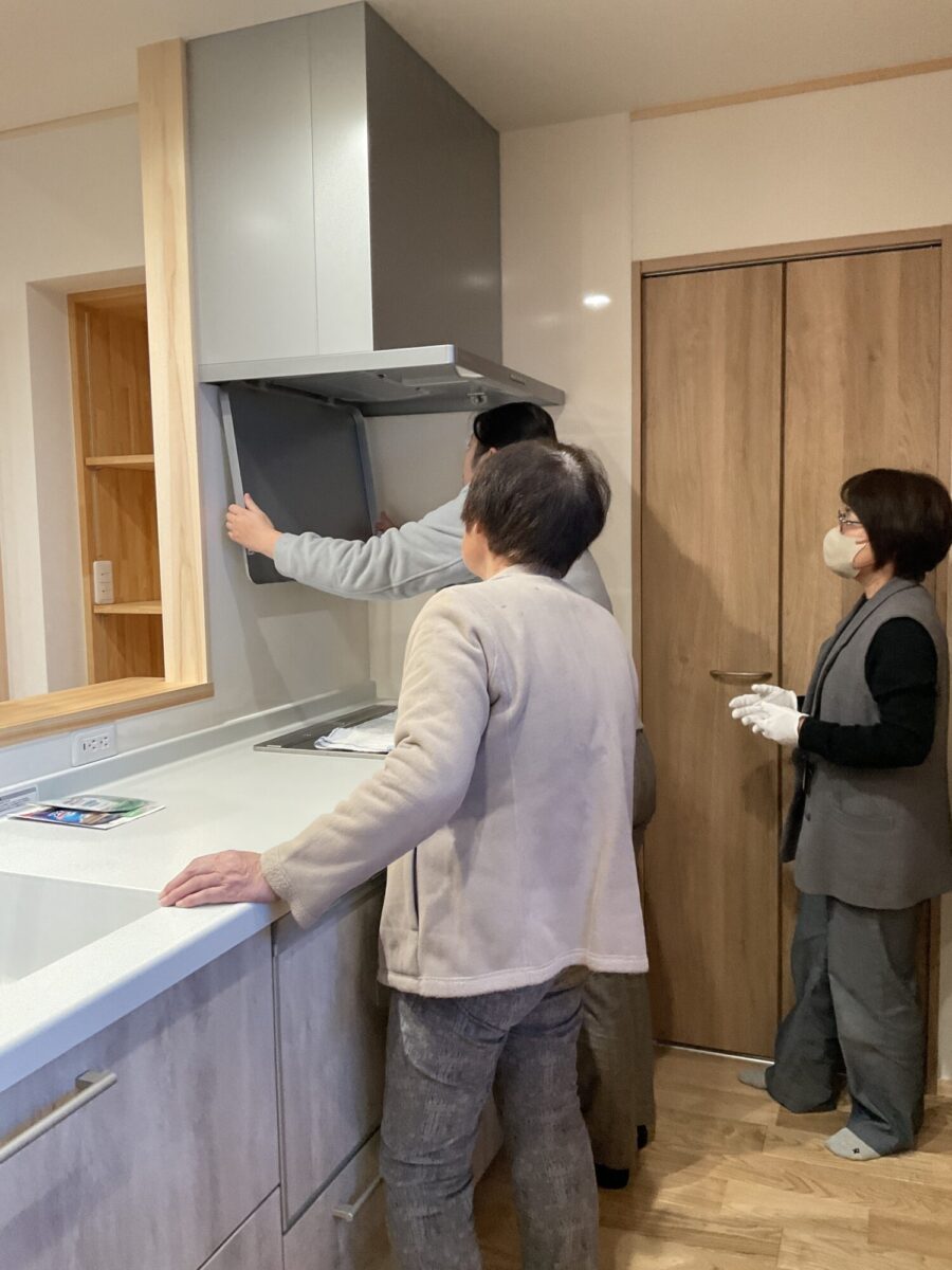 キッチンでは、IHや食洗機の使い方、レンジフードのお手入れ方法を、実際に触っていただきながらご説明しました。
