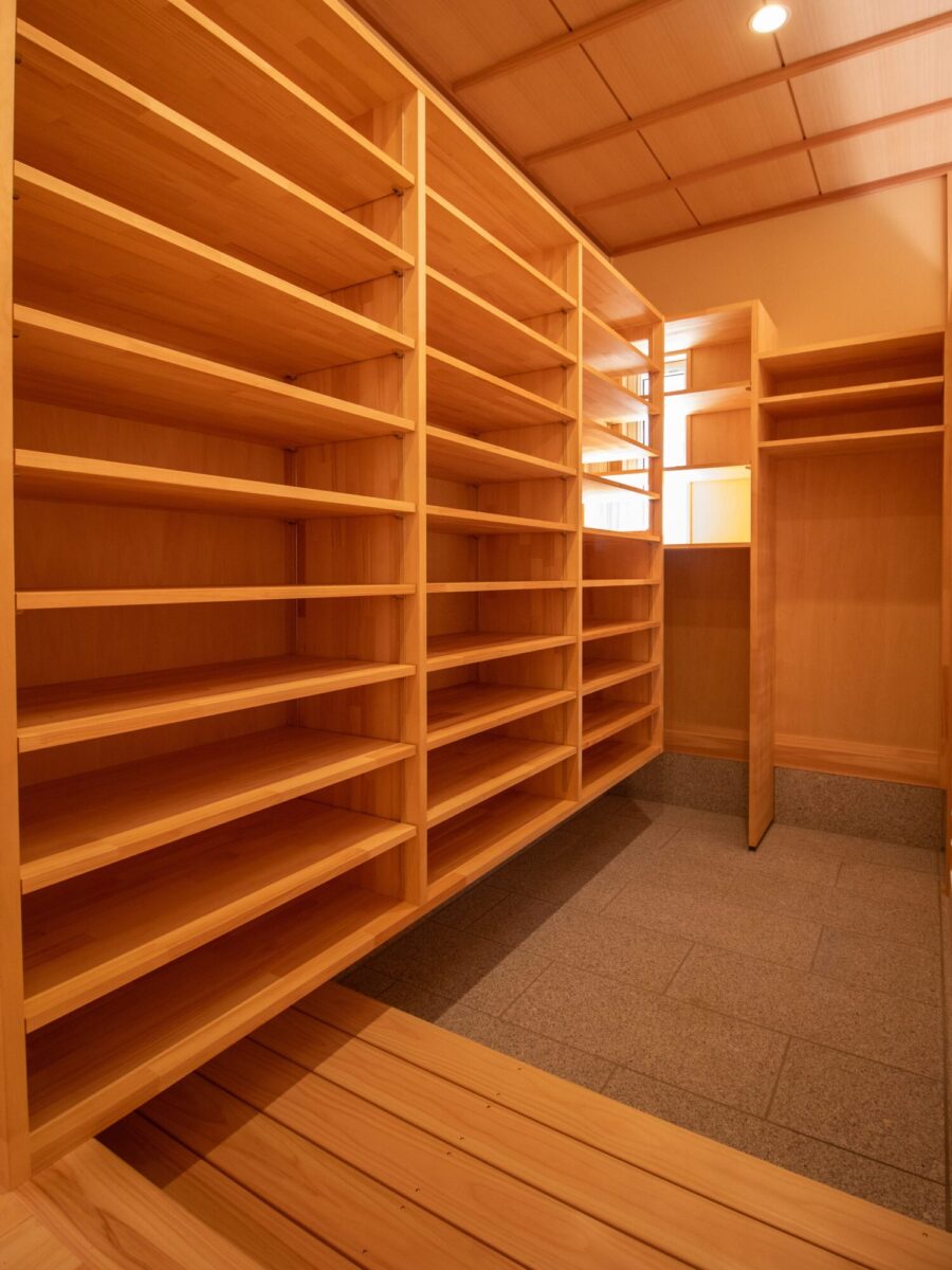 収納たっぷりの土間収納は、お客様の趣味のものが入るように寸法をお伺いして打合せさせていただきました。