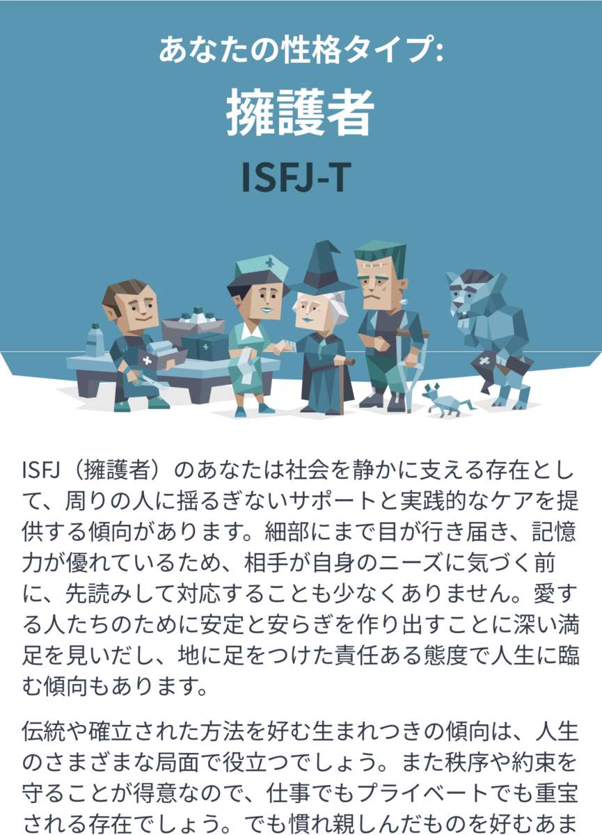 ちなみに、私のMBTIは「擁護者(ISFJ-T)」でした!