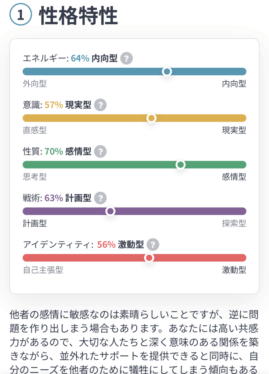 質問に答えていくだけなのに、自分の考え方や行動パターンが見透かされているようで、意外と面白い体験でした。