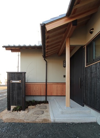 外部は「和」の佇まい。玄関ドアを開けたとき、道路から視線が入らないように焼き板の塀を設置しました。