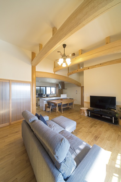 2階の若夫婦の住空間。ダイナミックな梁が空間にアクセントを加えています。