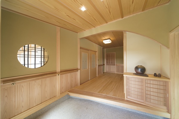松の床板、杉の腰板、桧の柱など、特性を活かしながら大工さんの技で仕立てられた風格ある玄関