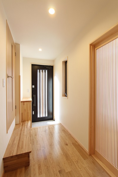 リビングと廊下を繋ぐ扉は明かりを通すオリジナル建具。