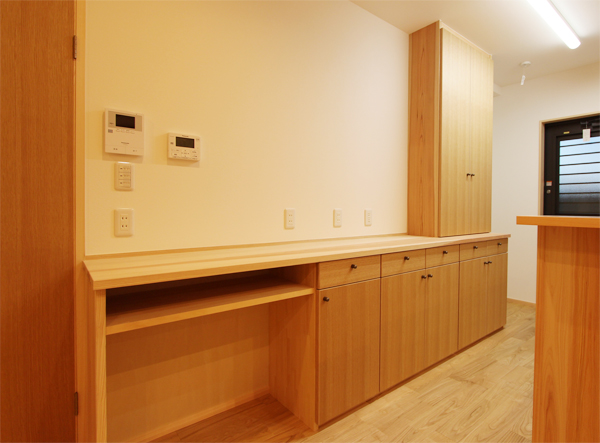 親世帯は平屋部、子世帯は2階建て部分で暮らす間取りです。玄関には舞良戸(まいらど)をはめ込んだ下駄箱や飾り棚、海布丸太(かいふまるた)をあつらえ、お客様をもてなします。