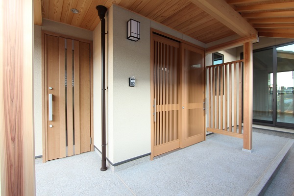 引き違い戸(右)は二世帯共有の玄関、開き戸(左)は親世帯専用の出入り口です。