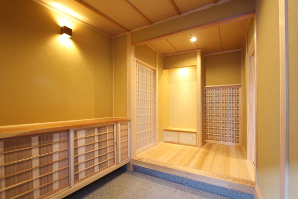 玄関に入ると、下駄箱や飾り棚、天井には海布丸太(かいふまるた)が見え、和の佇まいの雰囲気を醸し出しています。