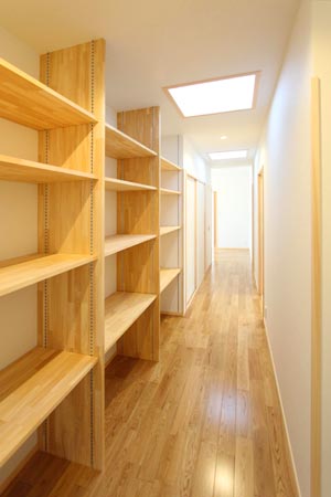 『廊下』には大量の本やCDなどを『収納できる棚』を取り付けました。