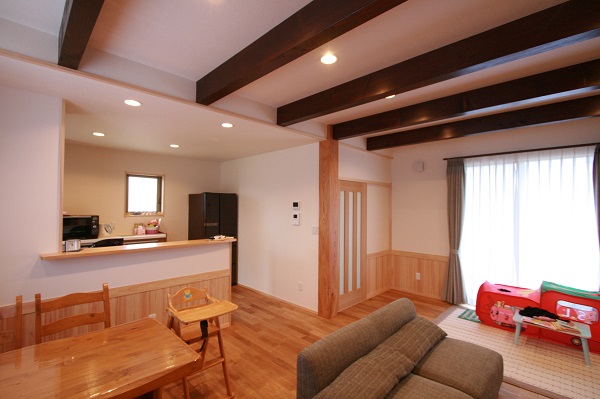お施主様のご実家の田を造成し新築。計画から住まいの完成まで、一年がかりでじっくり打合せをしていきました。家事の動線やライフスタイルの提案など、お施主様といろいろな建物を比較しながらの完成となりました。無垢板のナラフローリングはお施主様ご自身で『蜜蝋ワックス』を塗り仕上げられました。