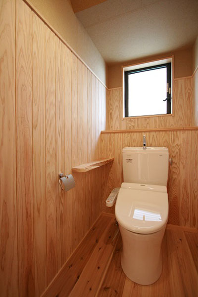 自然素材にこだわった家 #新築 #二階建て #和風 #焼き板 床・壁・天井に、吸湿性に優れ冬でも暖かい桧・杉の天然木を使用。クロスは自然素材100%「かみいぐさ・アイビーウォール」、断熱材は「ウールブレス」、さらに電磁波をカットする「オールアース」を採用。自然の力で快適に過ごす、お施主様こだわりの住まいです。 大きく美しい曲線の玄関框とさび丸太が特徴の玄関。 床・腰板・天井には吸湿性に優れた桧・杉で仕上げました。 和室 2階の子供室も杉で仕上げました。 こだわりのキッチン。 杉の床は水はけも良く暖かい。 システムバス トイレ。